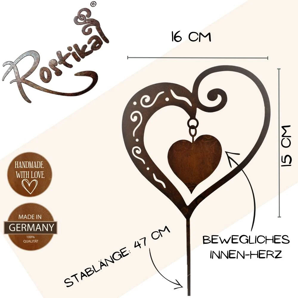 Das Dekoherz „Duett“ aus Edelrost ist eine stilvolle und liebevoll gestaltete Dekoration für Haus und Garten. Ob hängend am Fenster, als Blickfang an der Haustür oder als dekorativer Gartenstecker im Blumentopf – dieses rostige Herz verleiht jedem Ort eine warme, persönliche Note.