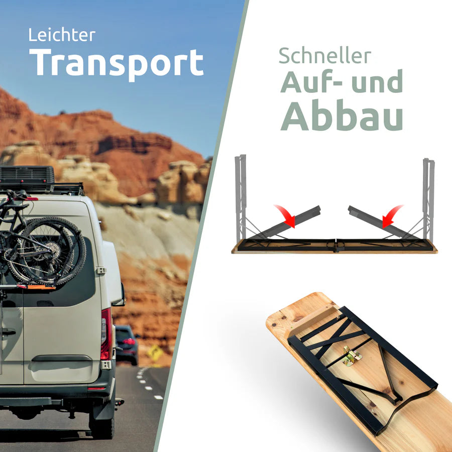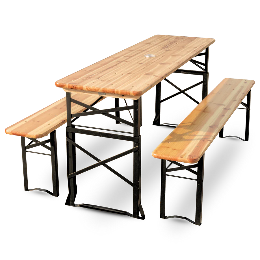 Unsere Bierzeltgarnituren bestehen aus robustem Holz, das für seine Langlebigkeit und natürliche Optik geschätzt wird. Das Set besteht aus einem stabilen Tisch und zwei passenden Bänken, die Platz für bis zu 4 Personen bieten. Diese Konstellation sorgt dafür, dass Ihre Gäste bequem sitzen und gesellige Runden genießen können.
