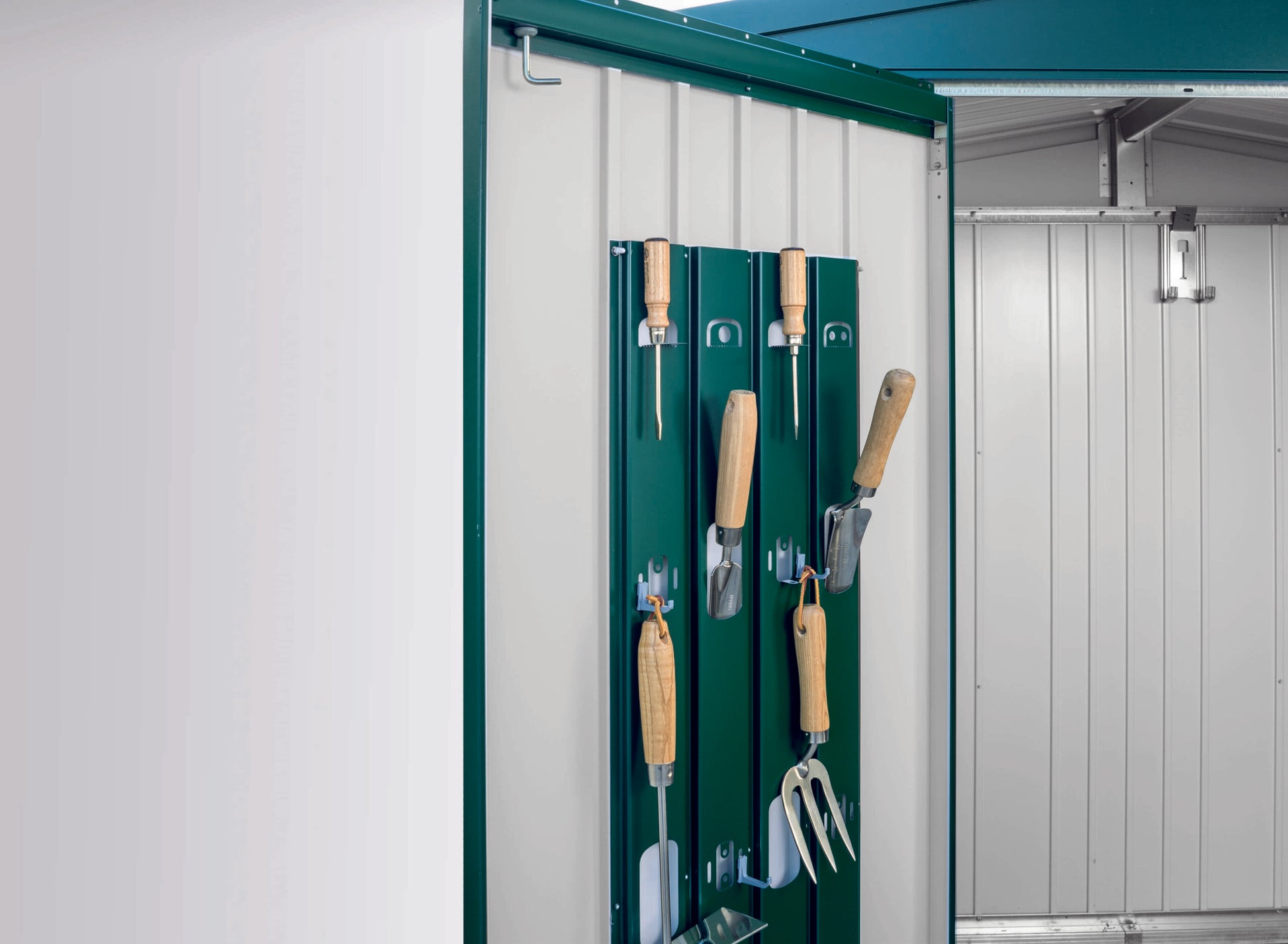 • 4 Gerätehalter (zum Aufhängen von Spaten, Rechen, Schläuchen etc.)