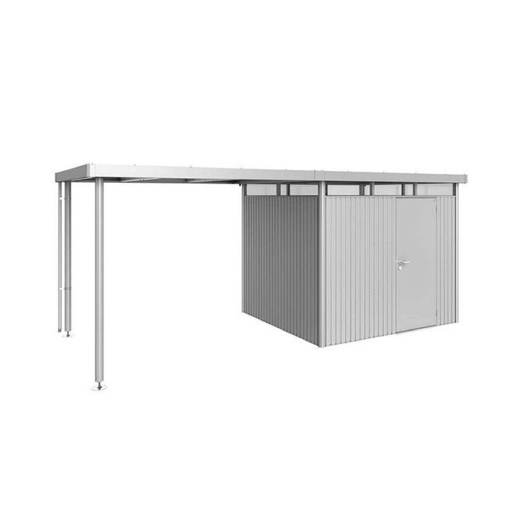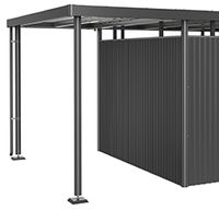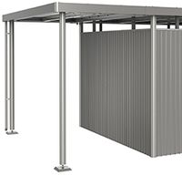Das Seitendach wird am Gerätehaus HighLine (ab Gr. 2A) wahlweise ein- oder beidseitig fixiert. Die Breite des Seitendaches beträgt 300cm. Die Alu- Stützen sind mit höhenverstellbaren Füßen ausgestattet. Zwei Regenfallrohre sind inkludiert