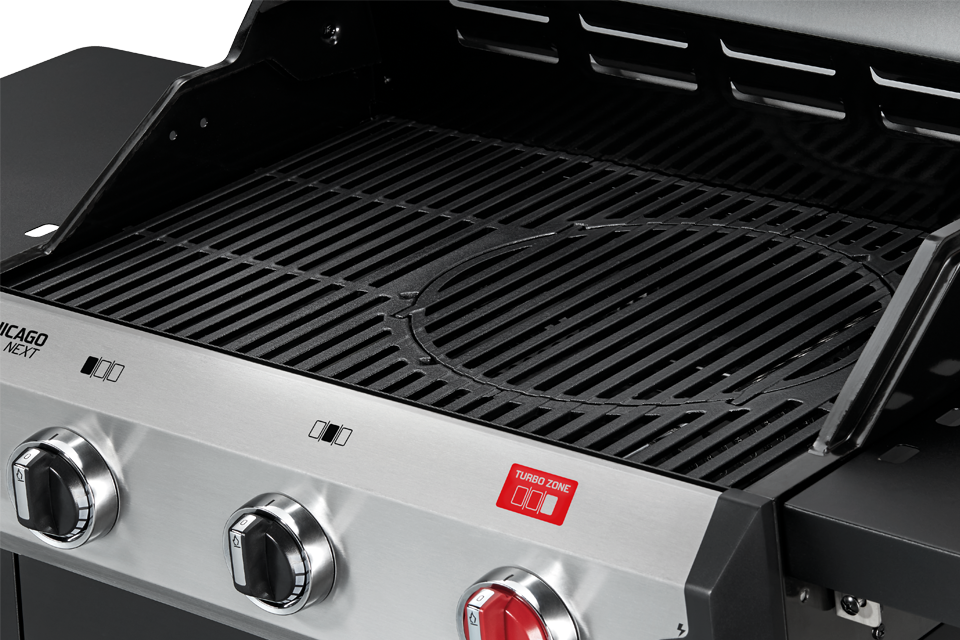 GRILLROUNDER Einer für alles. Alles in einem. BBQs der CHICAGO NEXT-Serie sind vollgepackte Grillrounder, mit denen du dich köstlich amüsierst. Sowohl die Dreibrenner-Modelle als auch das Vierbrenner- Modell verfügen über einen emaillierten Gussrost. Weiter unten im 3 R Turbo und 4 R Turbo schlummert die TURBO ZONE™, mit der du turboschnell Höchsttemperaturen an der Grillfläche erreichst. Für etwas „Abkühlung“ sorgt hingegen der Warmhalterost aus rostfreiem Edelstahl. Abgerundet wird der Grillrounder vom SWITCH GRID™-System das den Einsatz von Sear Grate, Pizzastein, Pfanne, Geflügelbräter oder Dutch Oven ermöglicht sowie durch zwei klappbare Seitenablagen.