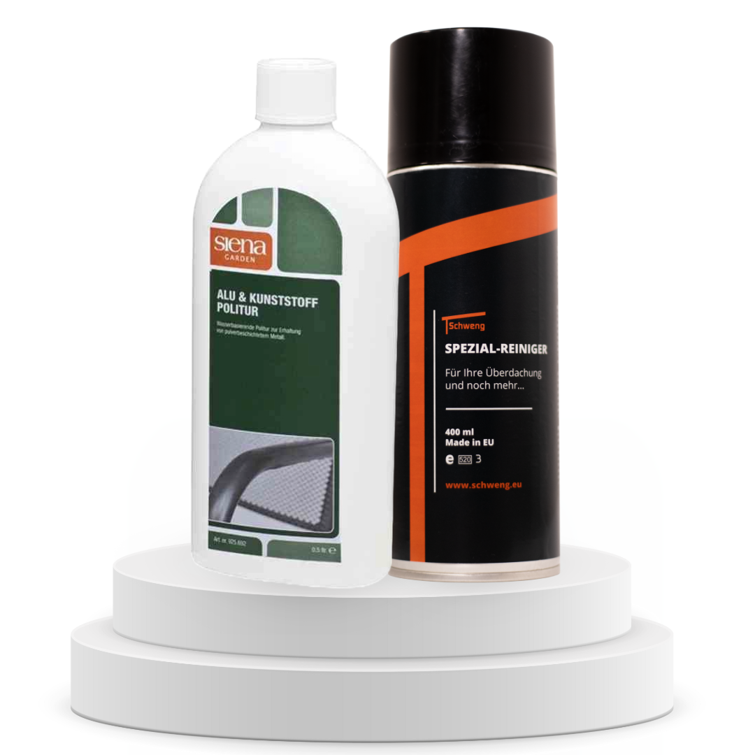 Unser Schweng Spezial-Pflege-Bundle ist die perfekte Lösung, um Ihre Überdachungen und pulverbeschichteten Oberflächen in einwandfreiem Zustand zu halten. Dieses Set enthält: