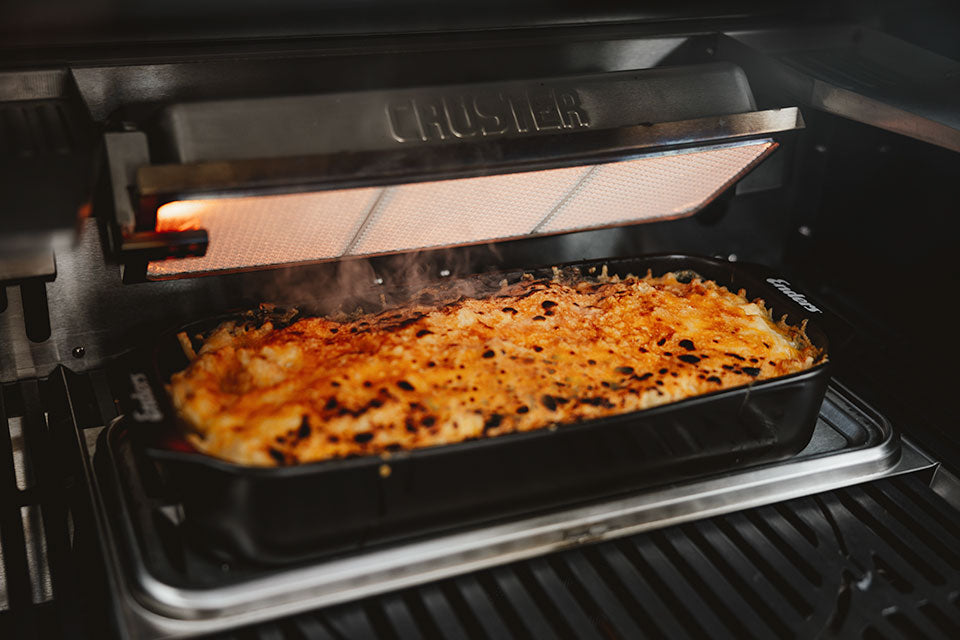 CRUSTER® (6,7 KW): von Backburner bis Oberhitze: in der Höhe und im Neigungswinkel stufenlos einstellbar, sorgt der Keramikbrenner für 800 °C Infrarot-Oberhitze im Grill