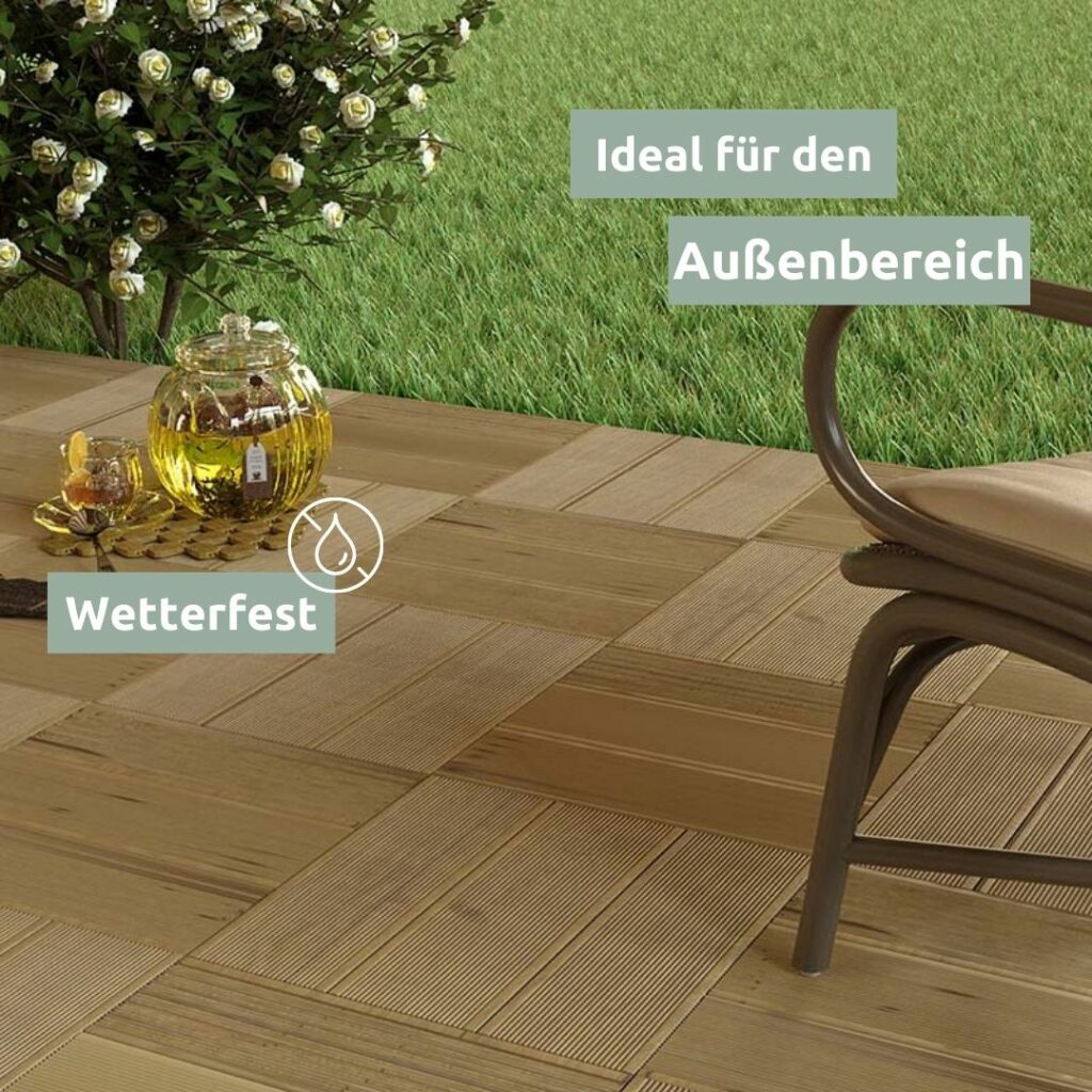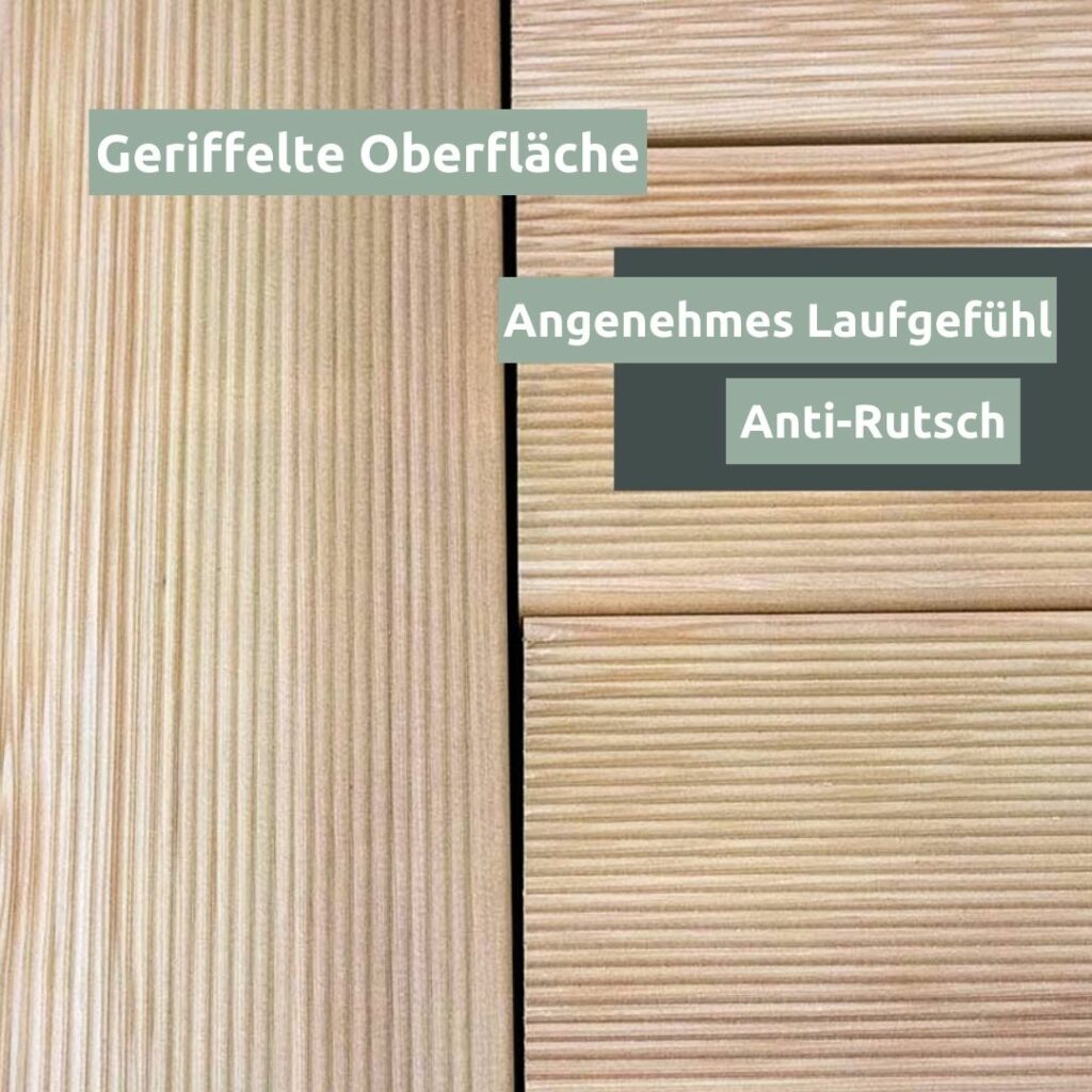 Unsere Holz-Fliesen aus massiver Lärche sorgen nicht nur für ein besonders angenehmes Laufgefühl auf Deiner Terrasse, sondern auch für eine gemütliche und freundliche Atmosphäre. Dank der Anti-Rutsch-Nutung kannst Du Dich mit einem sicheren Gefühl auf dem Untergrund fortbewegen. Da wir bei der herstellung auf chemischen Holzschutz verzichten, sind die Holzfliesen barfußfreundlich. Inklusive der Unterkonstruktion hat die Holzfliese eine Stärke von insgesamt 4,5 cm.
