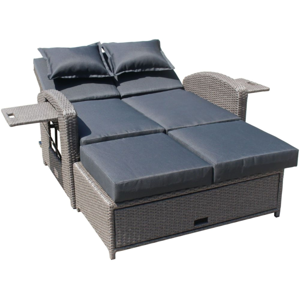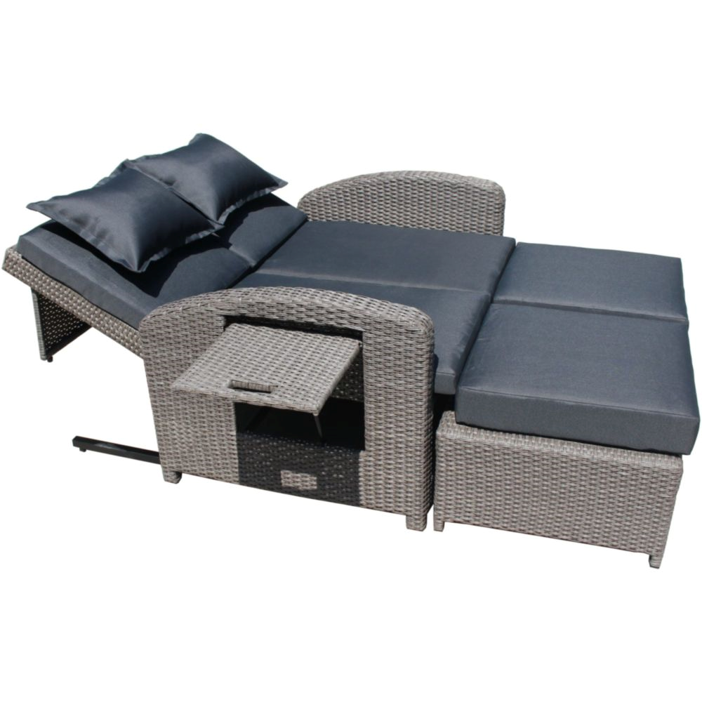 Entdecken Sie mit dem Funktionssofa NIZZA die perfekte Kombination aus Design, Komfort und Funktionalität für Ihren Garten, Balkon oder die Terrasse. Das hochwertige Gartensofa überzeugt durch ein robustes Stahlgestell, wetterfestes Kunststoffgeflecht in edlem Weidengrau und praktische Zusatzfunktionen.