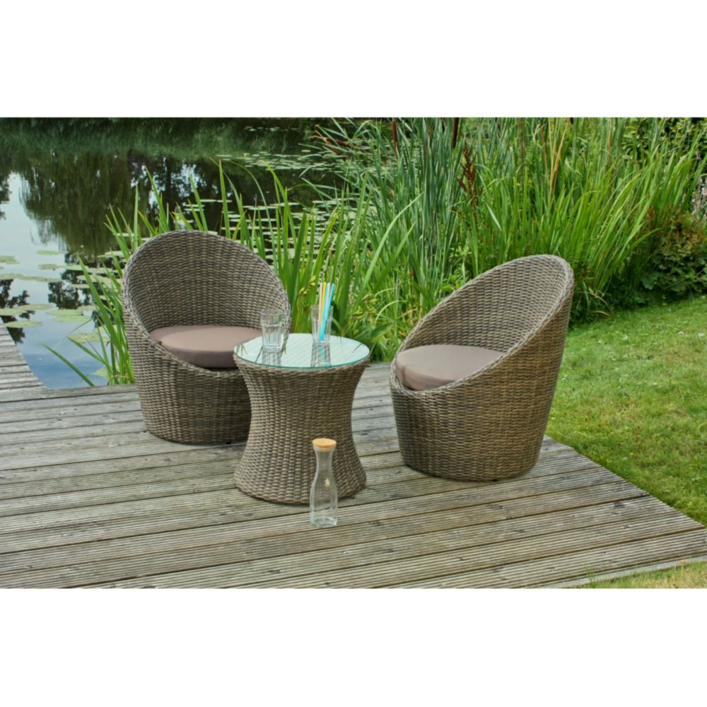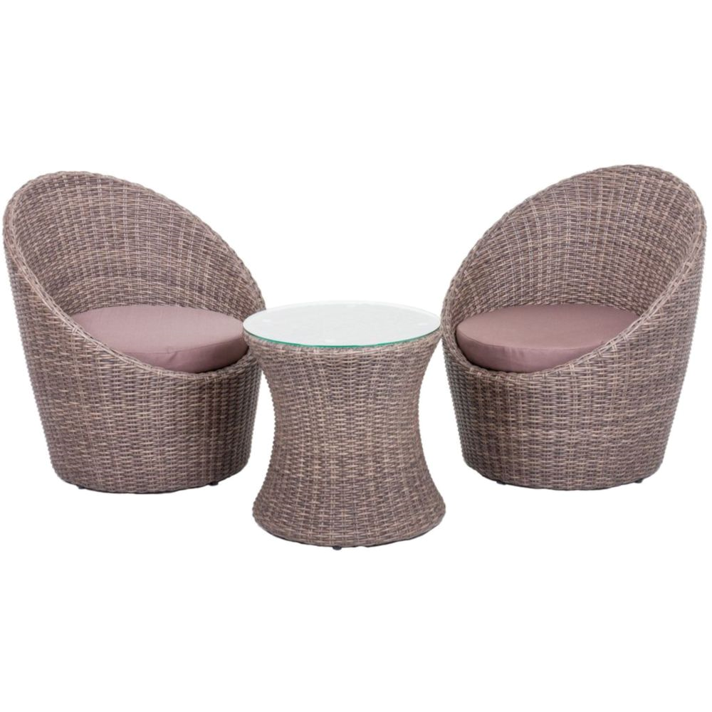 Das Set besteht aus zwei bequemen Sesseln mit elegantem Kunststoffgeflecht in Korianderbraun und einem runden Beistelltisch mit Glasplatte. Das schwarze Stahlgestell sorgt für Stabilität und Langlebigkeit, während das halbrunde Kunststoffgeflecht für eine stilvolle Rattan-Optik steht. Die transparente Glasplatte verleiht dem Tisch eine moderne, hochwertige Note.