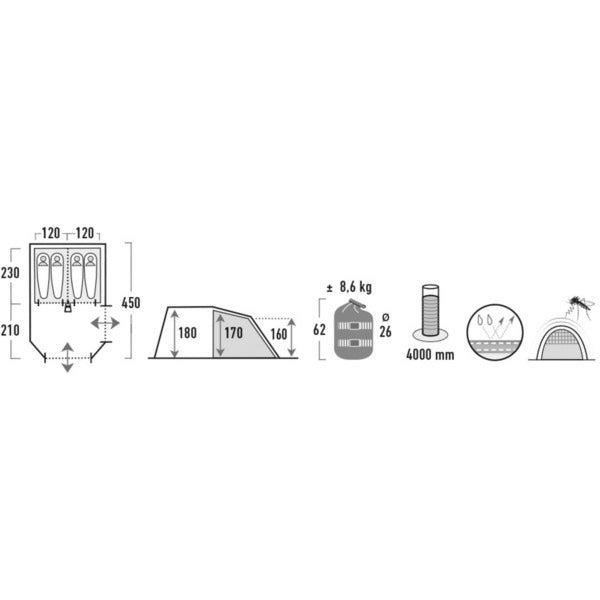 | Zeltform | Tunnel-Zelt, für 4 Personen | ||