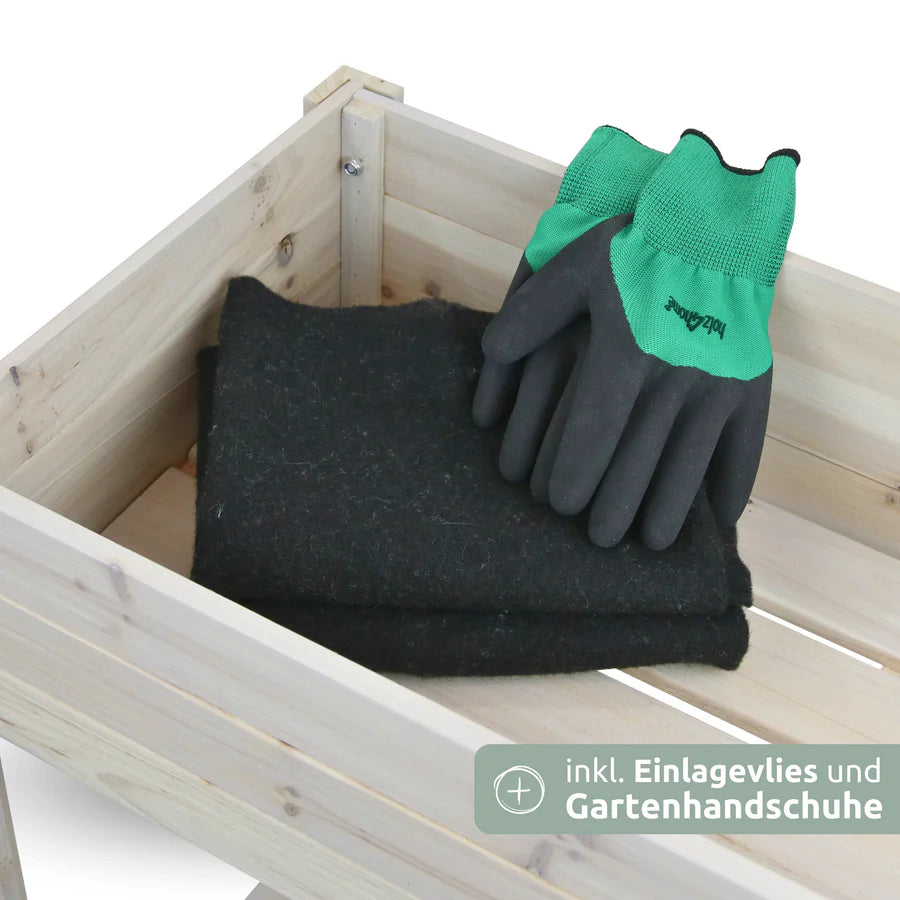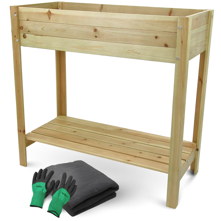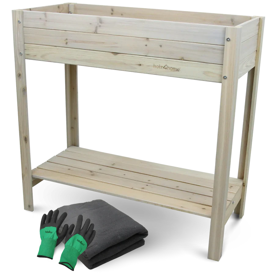 Um eigenes Gemüse anzupflanzen brauchst Du keinen großen Garten. Hochbeete aus Holz liegen sowohl auf dem Land, als auch in städtischen Gebieten groß im Trend. Unser stabiles Hochbeet in braun aus Tannenholz fasst ein Volumen von 63 Litern und passt mit den Maßen 37 x 78 x 80 cm (B x H x L) ideal in den Garten, auf die Terrasse oder auf den Balkon. Die ergonomische Arbeitshöhe ermöglicht ein entspanntes Gärtnern im Stehen, wodurch weder Rücken, noch Knie unnötig belastet werden. Zur weiteren Ausstattung des Balkon Kräuterbeets gehören eine Einlegefolie aus Vlies sowie ein praktisches Ablagefach für Gartenutensilien, Gießkanne oder Pflanzgefäße. Nicht die passende Farbe? Dann schaue Dir unser Hochbeet aus Tannenholz in grauweiß an.