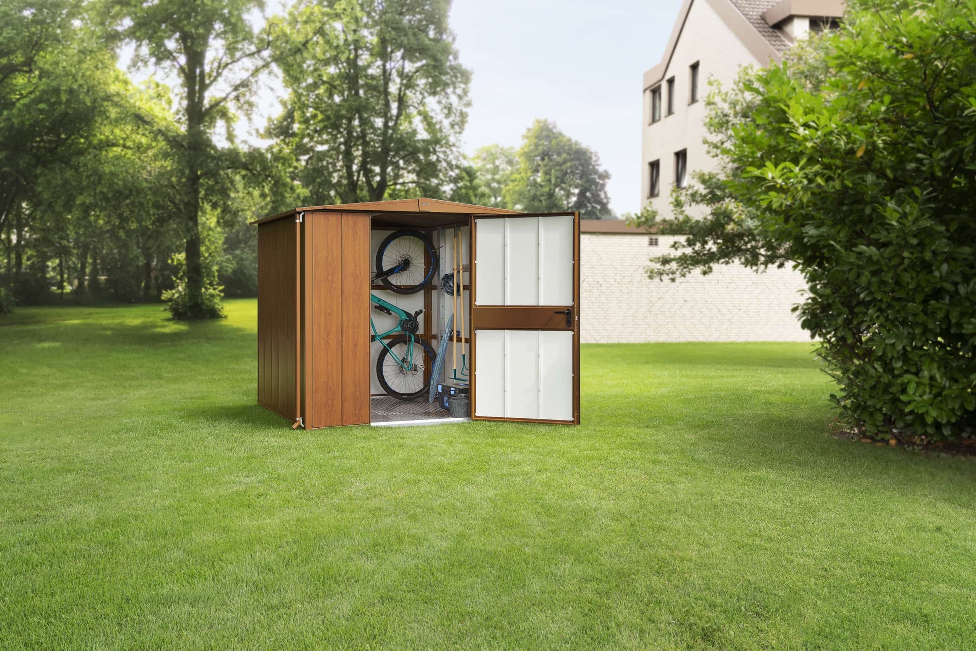 Mit der gleichmäßigen, aufgeräumten Ansicht lassen sich die Gerätehäuser hervorragend mit Fassaden, Haustüren und Garagentoren kombinieren.