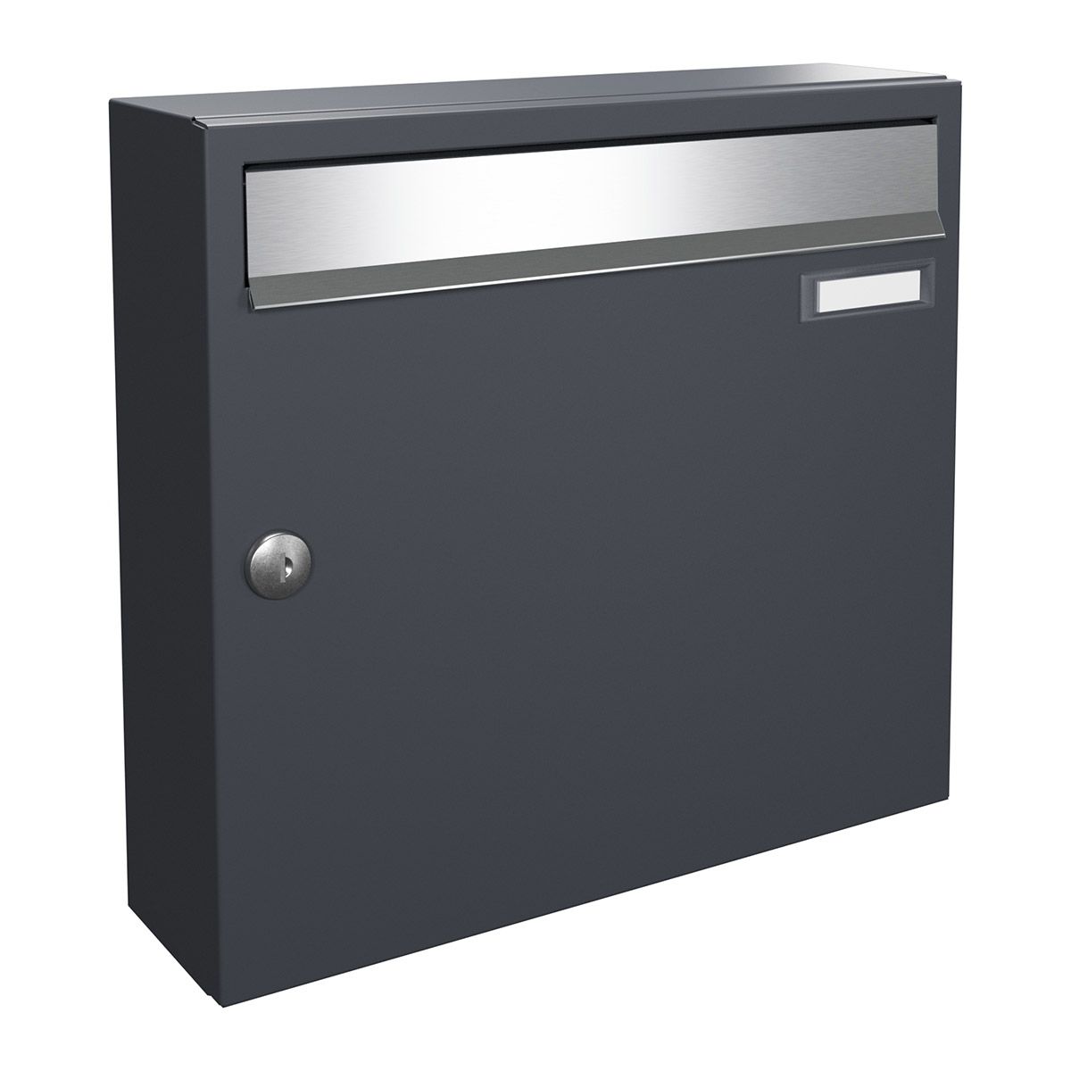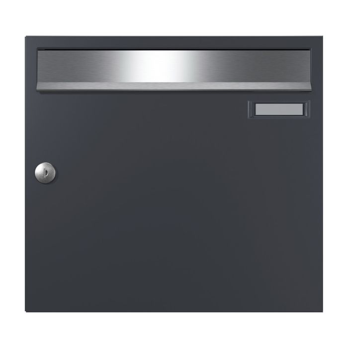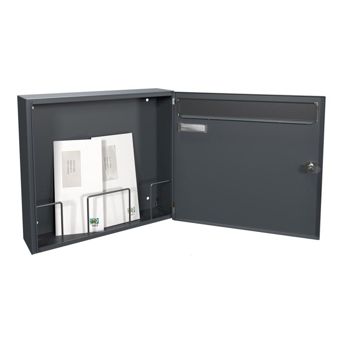 Hier mit dem Korpus in pulverlackiertem Anthrazit und der Klappe in Edelstahl. Zur Wandmontage. EN 13724-konform und mit 12 Litern Volumen groß genug für mehrere Zeitschriften. Ein Haltebügel sorgt dafür, dass das Postgut beim Öffnen der Tür an Ort und Stelle bleibt.
