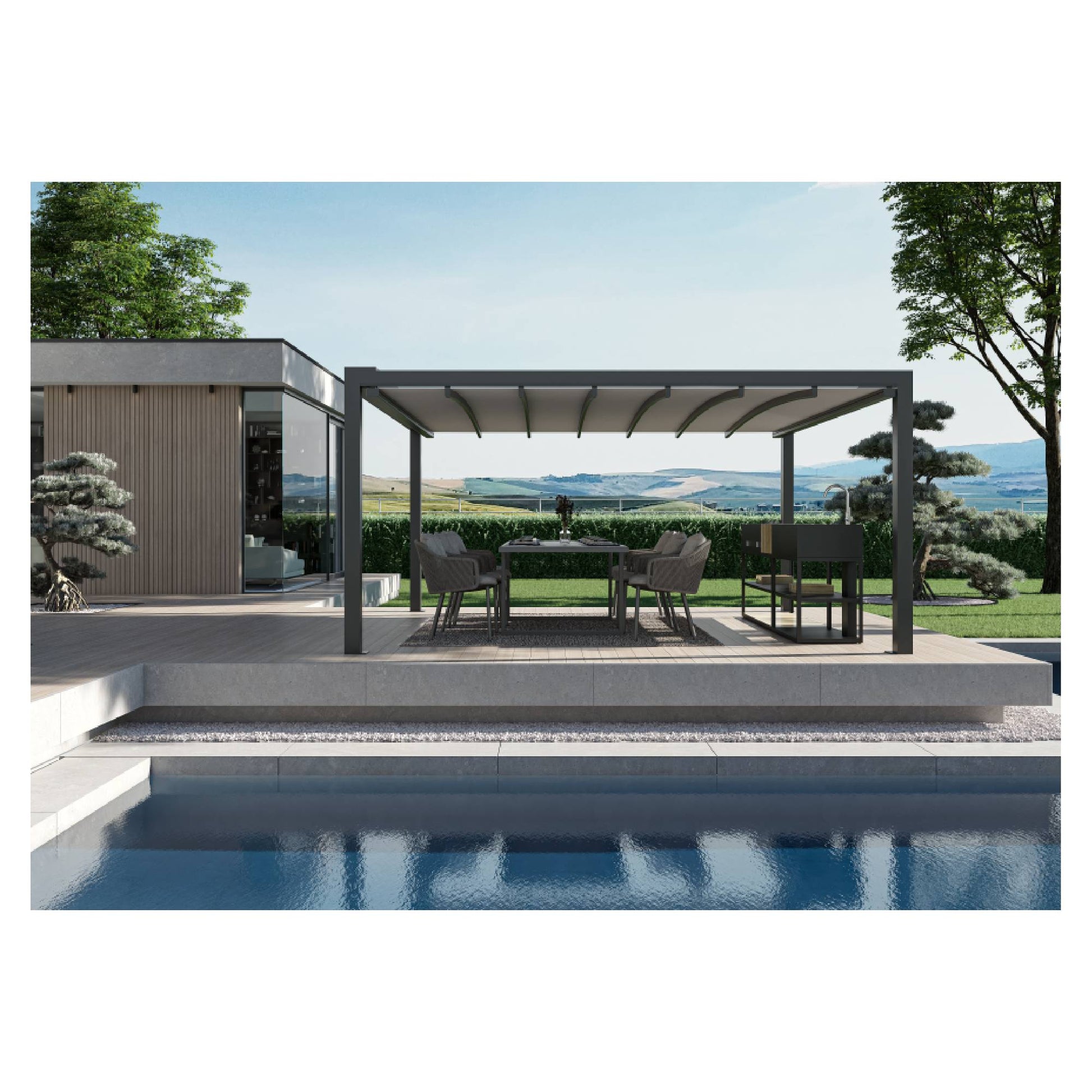 KEPLAN ist eine innovative Pergola aus Aluminium mit flachem Dach und faltbarem Tuch, die sich perfekt in jede moderne Designlösung einfügt. Ihr minimales Design bricht mit dem traditionellen Muster der Pergola mit schrägem Dach: Funktionalität und Komfort werden mit einer flachen Geometrie kombiniert, die sich für die unterschiedlichsten Projekte im Freien eignet, sowohl im Wohnbereich als auch bei ho.re.ca.
