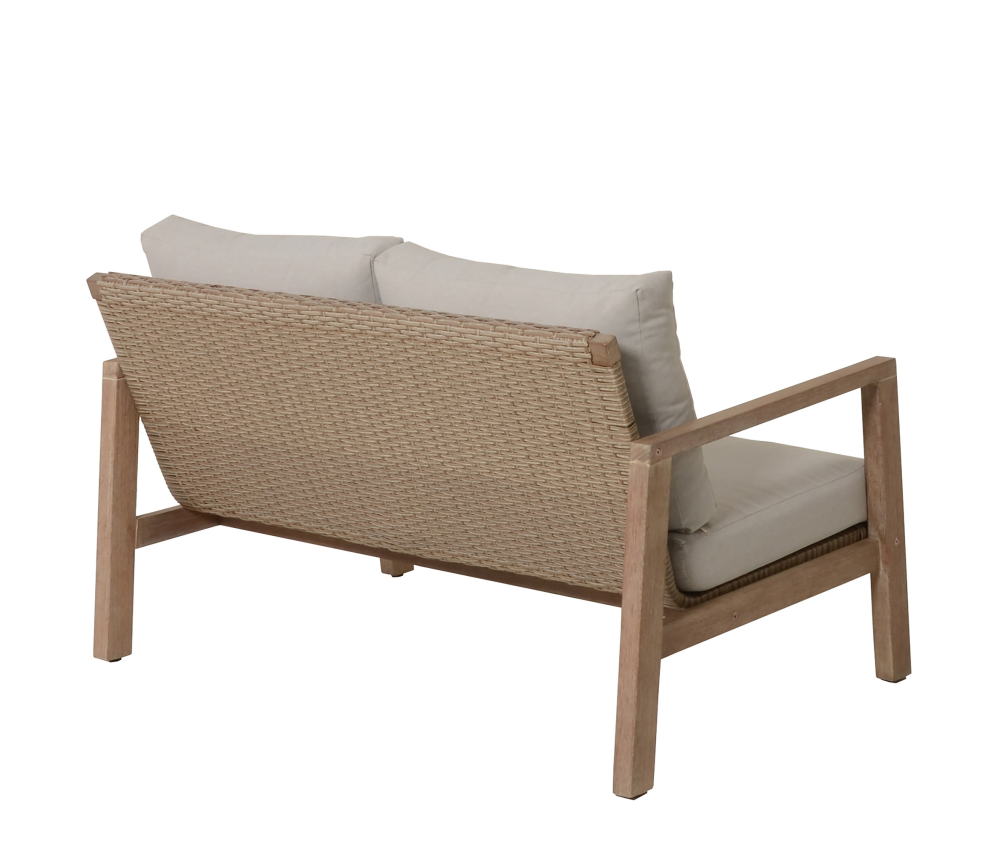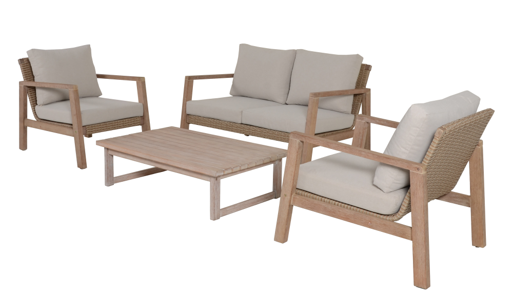 Verleihen Sie Ihrem Außenbereich stilvolle Gemütlichkeit mit dem hochwertigen Lounge-Set SAN MATEO. Das 4-teilige Gartenmöbel-Set aus 100 % FSC®-zertifiziertem Eukalyptus-Holz in edlem washed Braun ist die perfekte Wahl für Terrasse, Balkon oder Garten. Die Kombination aus geöltem Massivholz, wetterfestem Kunststoffgeflecht und bequemen beigefarbenen Polsterkissen bietet nicht nur ein elegantes Design, sondern auch besten Komfort für entspannte Stunden im Freien.