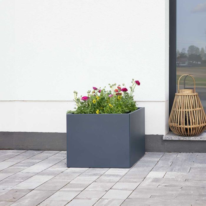 Pflanzkübel ermöglichen Blumenmeere auf der Terrasse, dem Balkon oder an Gartenwegen, ohne die üblichen Nachteile wie Erde auf dem Fußboden. Unsere Pflanzkübel sind für den Außenbereich aus rostfreiem, verzinktem Stahlblech gefertigt und in zeitlos elegant-neutralem Anthrazit pulverlackiert. Die hier gezeigte Modellvariante hat eine Grundfläche von 50 x 50 cm und eine Höhe von 40 cm und ist die kleinste von insgesamt drei Größen. Die Pflanzbox wird per Post versendet. Der Pflanzkübel ist bereits fertig montiert und lässt sich mit den anderen beiden Modellen zu ganzen Landschaften kombinieren.