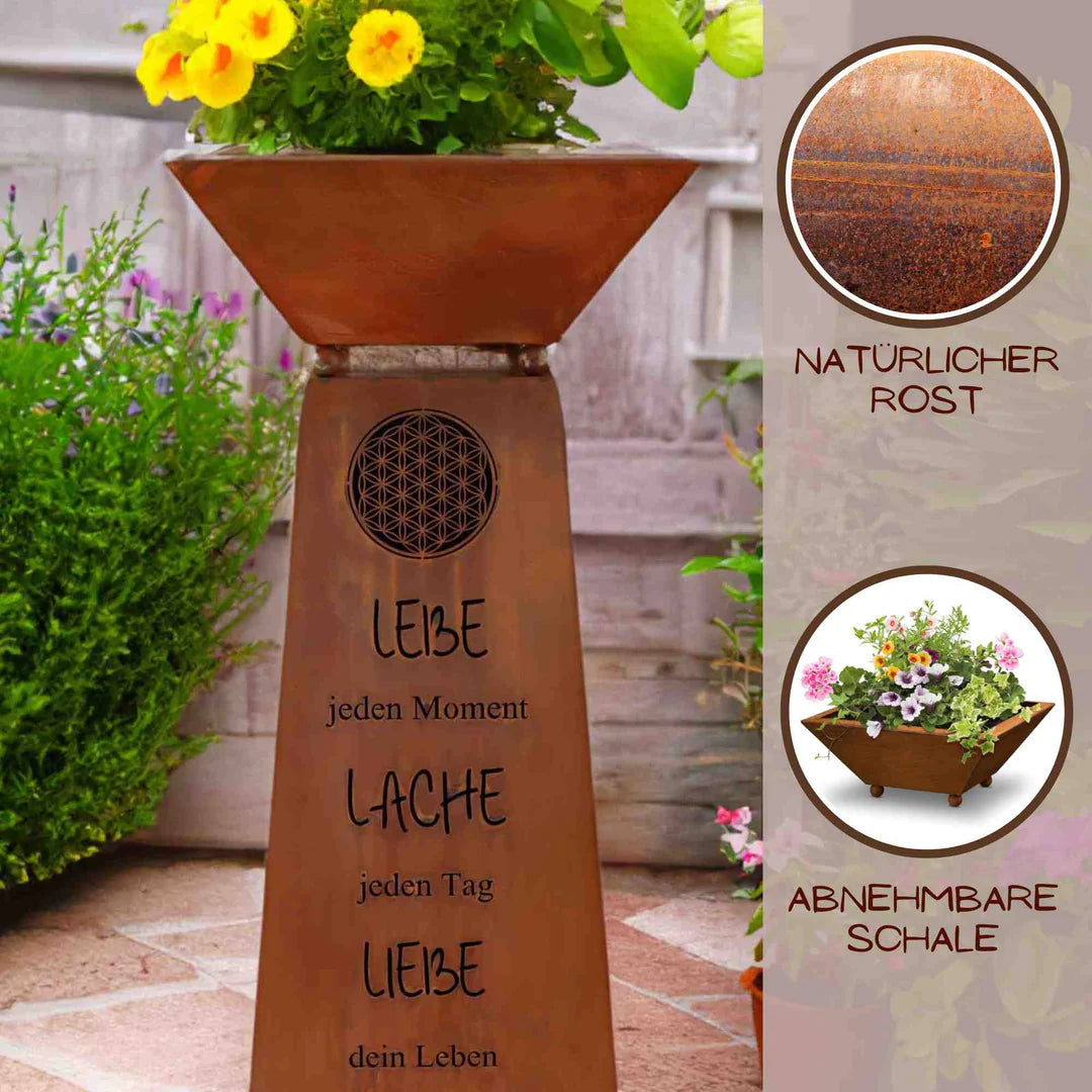 Rost Deko Pflanzsäule mit Blume des Lebens & Lebensspruch