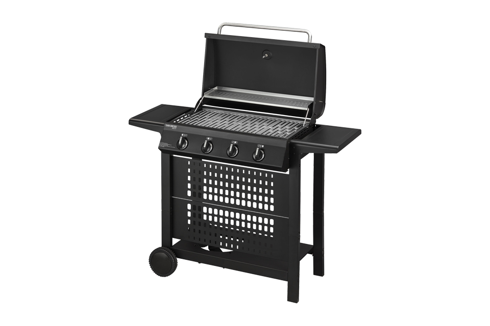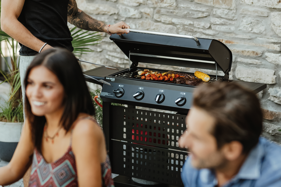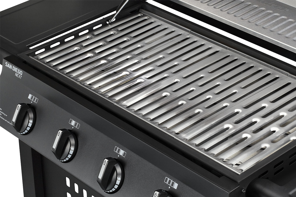 ZU VIEL PLATZ, UM KLEIN ZU SEIN. Die BBQs der SAN DIEGO NEXT-Klasse haben eine designerisch Verjüngungskur durchlaufen. Nun sind sie nicht bloß Wunder der Grillkultur, sondern auch eine noch größere Augenweide, als sie es ohnehin schon waren. Die wahlweise mit zwei oder vier Brennern erhältlichen Modelle bieten großzügige Zubereitungs- und Ablageflächen, beanspruchen dabei aber nur das Nötigste an Platz. Ideale Voraussetzungen für kleine Terrassen, Mini-Balkone oder knisternde Rendezvous. Die verbauten Gestelle sind robust und verfügen neben einer großen Ablage für Teller und Grillgut über zwei weitere an den Seiten — etwa für Gewürze oder Saucen. Ein Warmhalterost aus Edelstahl schwingt beim Öffnen und Schließen der Haube geschmeidig mit. Und der Grillrost, ebenfalls aus beständigem Edelstahl, lässt sich nach der Brutzelsession wieder ganz easy reinigen. Und wenn wir schon bei sauber sind: Das cleane, mattschwarze Design des Edelstahlbrenner-Gasgrills passt perfekt in jedes erdenkliche Ambiente.