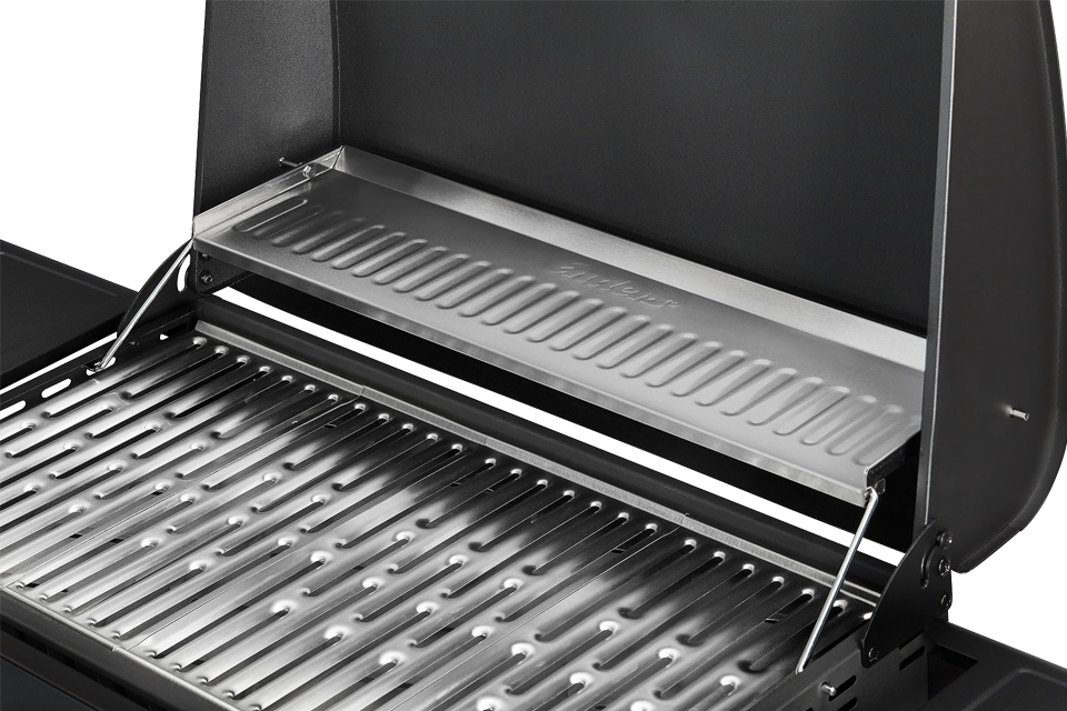 Großer, mitschwingender Warmhalterost aus Edelstahl hält fertiges Grillgut warm