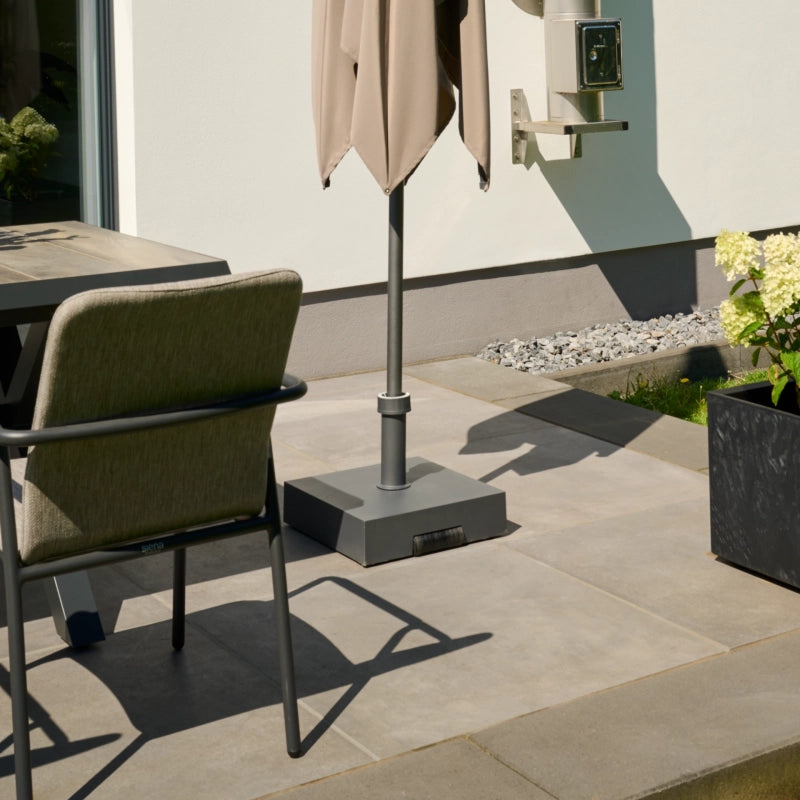 Der betongefüllte Schirmständer mit Kunststoffmantel besticht durch seine moderne Optik. Das Kunststoffrohr fasst Schirme mit einem Unterstockdurchmesser von 21 bis 54 mm. Die Supergrip-Überwurfmutter sorgt für einen stabilen und festen Stand des Schirmstocks. Griff und Rolle erleichtern die Mobilität. Die Unterseite des Schirmständers ist aus Kunststoff und schont den Terrassen- oder Balkonboden.