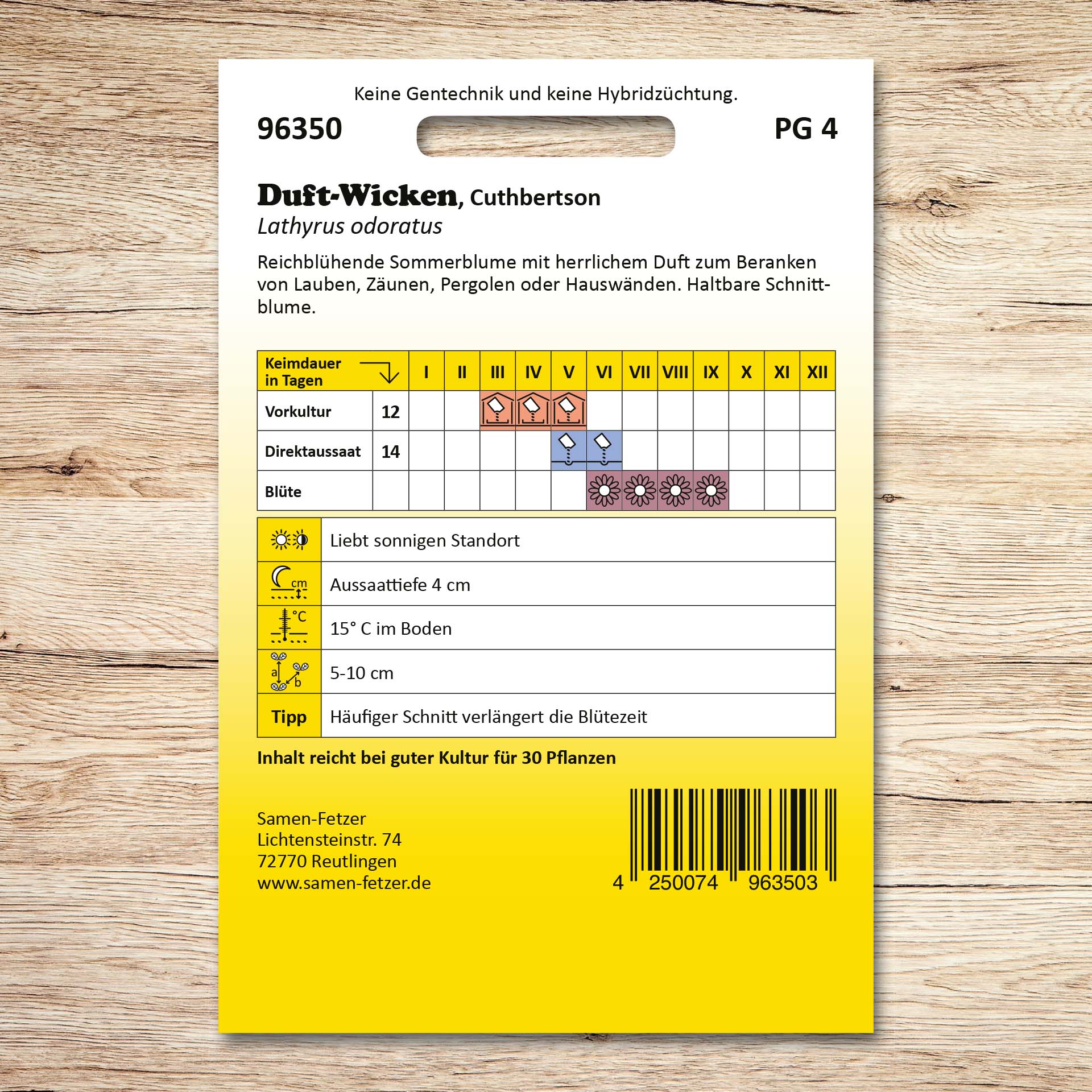 Wicken sind reichblühende Sommerblumen, die einen herrlichen Duft haben. Die „Cuthbertson“ Prachtmischung eignet sich hervorragend zum Beranken von Lauben, Zäunen, Pergolen und Hauswänden. Außerdem sind die bunten Wicken sehr haltbare Schnittblume.