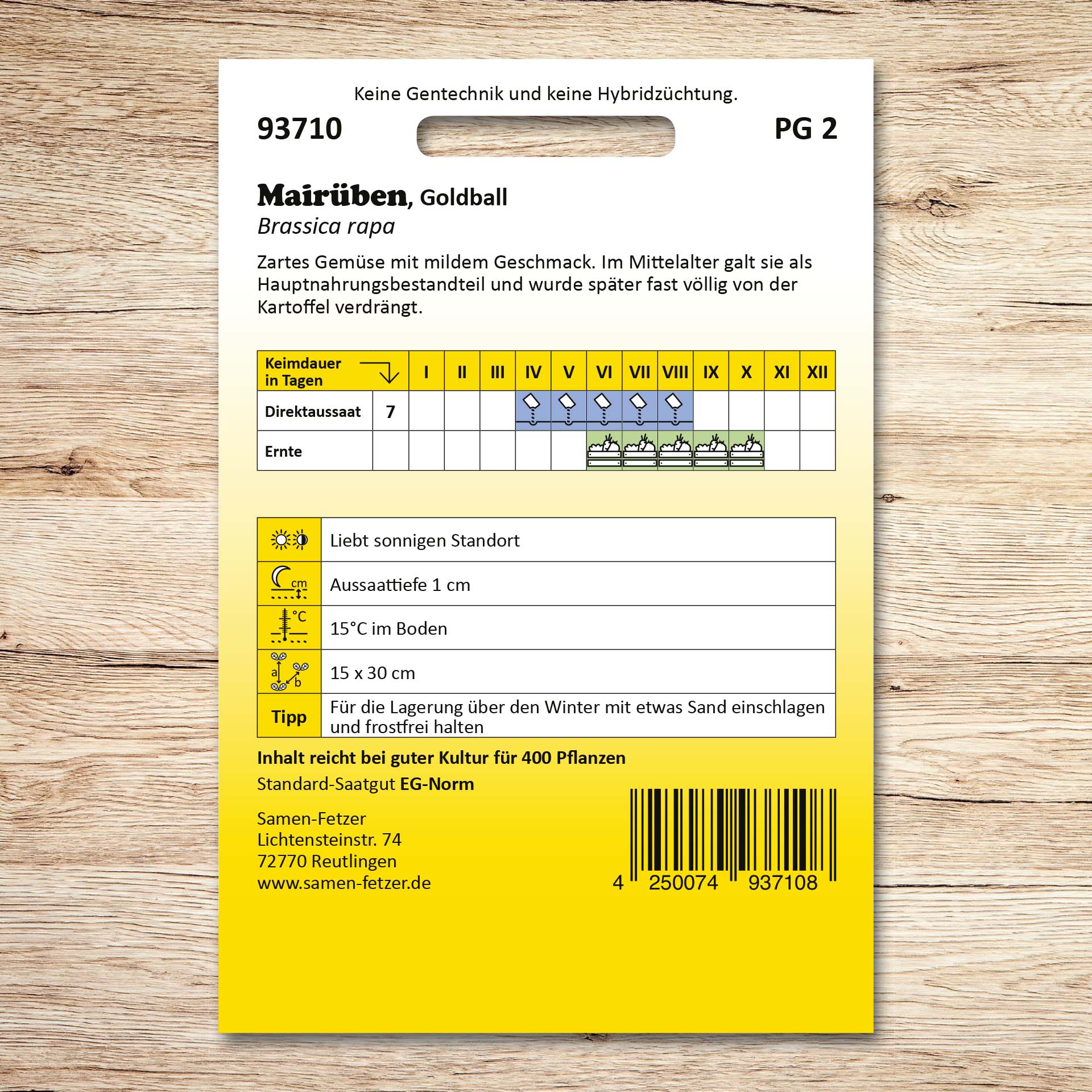 Im Mittelalter galten Mairüben als Hauptnahrungsbestandteile und wurden später fast völlig von den Kartoffeln verdrängt. Die Mairübe „Goldball“ ist ein sehr zartes Gemüse, welches einen milden, kohligen Geschmack hat. Mit dem Anbau dieser historischen Sorte unterstützen Sie die Erhaltung der Sortenvielfalt.
