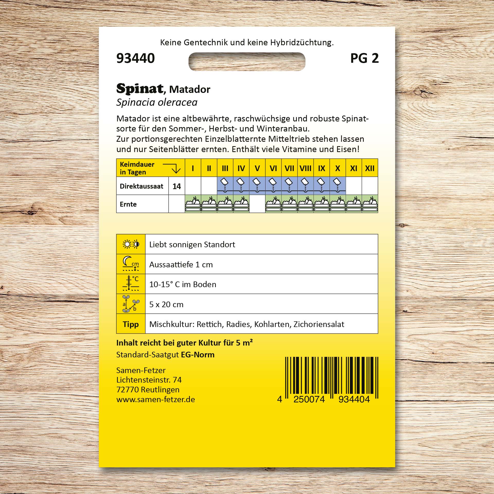 „Matador“ ist eine altbewährte, raschwüchsige und robuste Spinatsorte für den Sommer-, Herbst- und Winteranbau. Die Blätter sind dunkelgrün, groß und raschwüchsig. Spinat ist ein sehr gesundes Gemüse, welches viel Eisen und viele Vitamine enthält. Lassen Sie für eine portionsgerechte Einzelblatternte die Mitteltriebe stehen und ernten Sie nur die Seitenblätter, denn diese wachsen nach. Die Spinate bevorzugen einen sonnigen, nahrhaften und feuchten Boden. Mit dem Anbau dieser historischen Spinatsorte unterstützen Sie die Erhaltung der Sortenvielfalt.