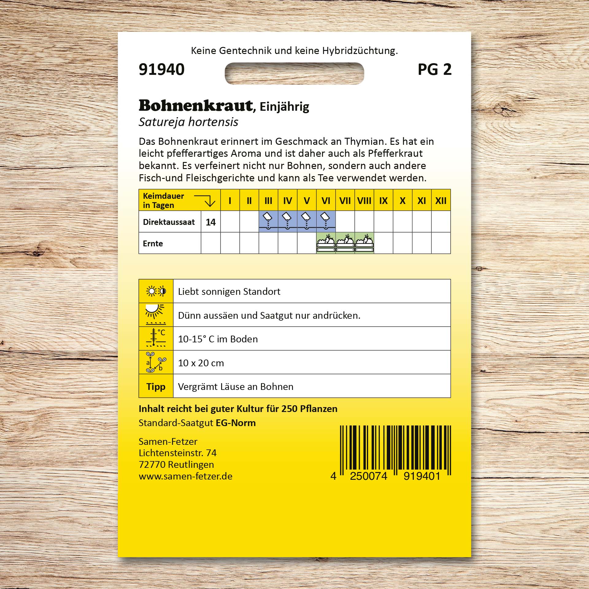 Das Bohnenkraut erinnert dem Geschmack nach an Thymian. Dieses Kraut hat ein leicht pfefferartiges Aroma und ist daher auch unter dem Namen Pfefferkraut bekannt. Es verfeinert nicht nur Bohnen, sondern auch andere Fisch-und Fleischgerichte und kann als Tee verwendet werden. Das einjährige Bohnenkraut ist ein Lichtkeimer, daher das Saatgut nicht mit Erde bedecken. Eine Mischkultur mit Bohnen, Salat und Roter Bete wird empfohlen. Mit dem Anbau dieser historischen Sorte unterstützen Sie die Erhaltung der Sortenvielfalt.