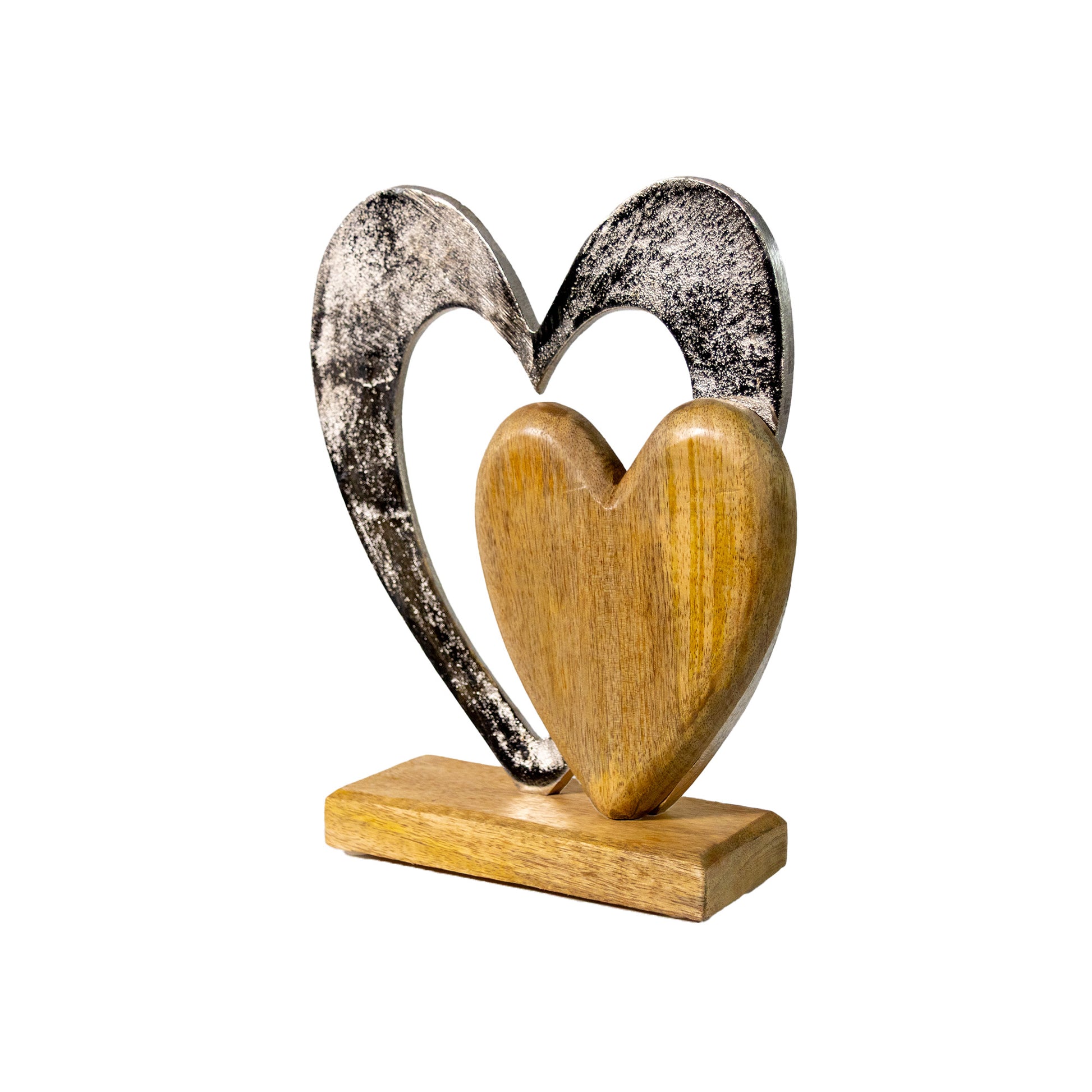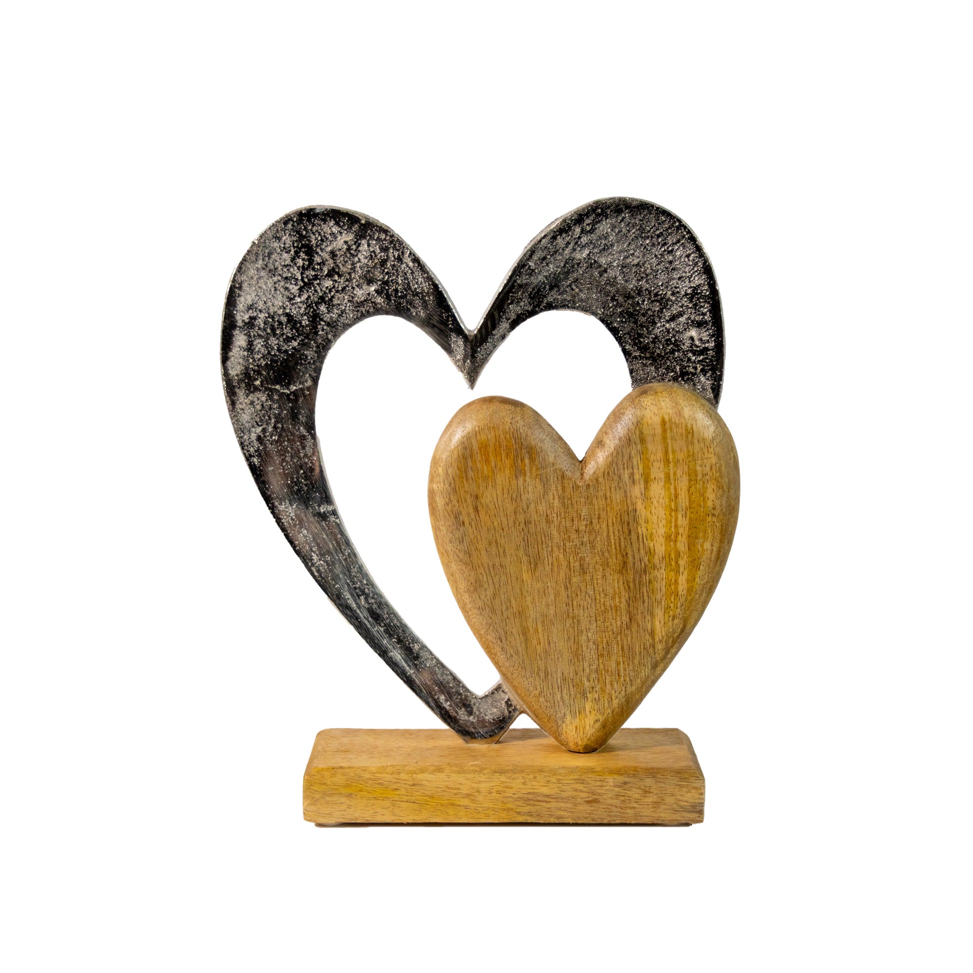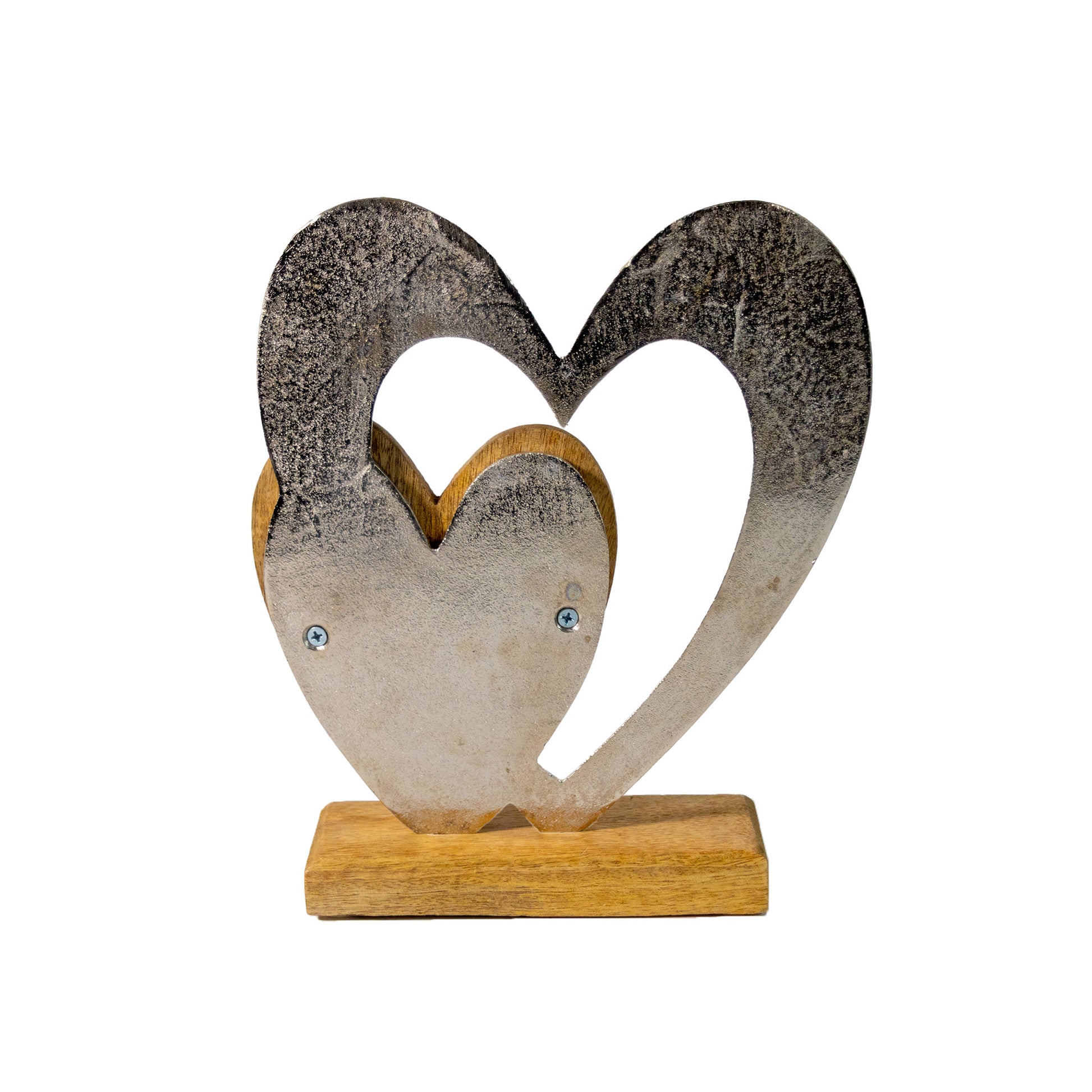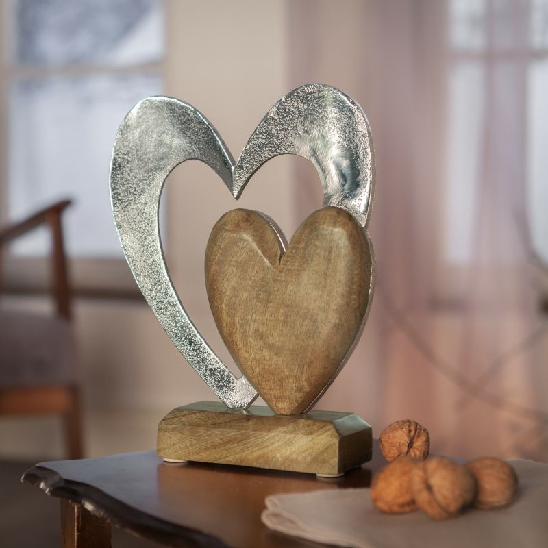 naturbelassenes Mangoholz, antik glänzender Aluminiumguss in Silber, möbelschonende Filznoppen