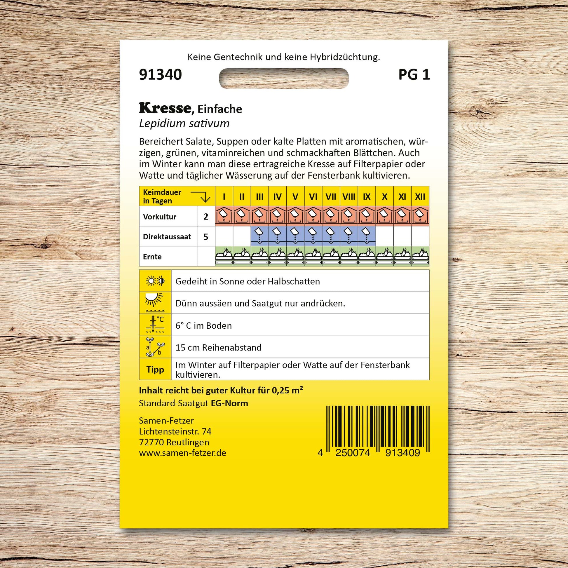 Diese einfache Kresse bereichert Salate, Suppen oder kalte Platten mit ihren aromatischen, würzigen und besonders vitaminreichen Blättchen. Überzeugen Sie sich selbst von dieser grünen und schmackhaften Kressesorte! Auch im Winter kann man diese ertragreiche Gartenkresse auf Filterpapier oder Watte auf der Fensterbank kultivieren. Sie ist sehr schnellwüchsig!