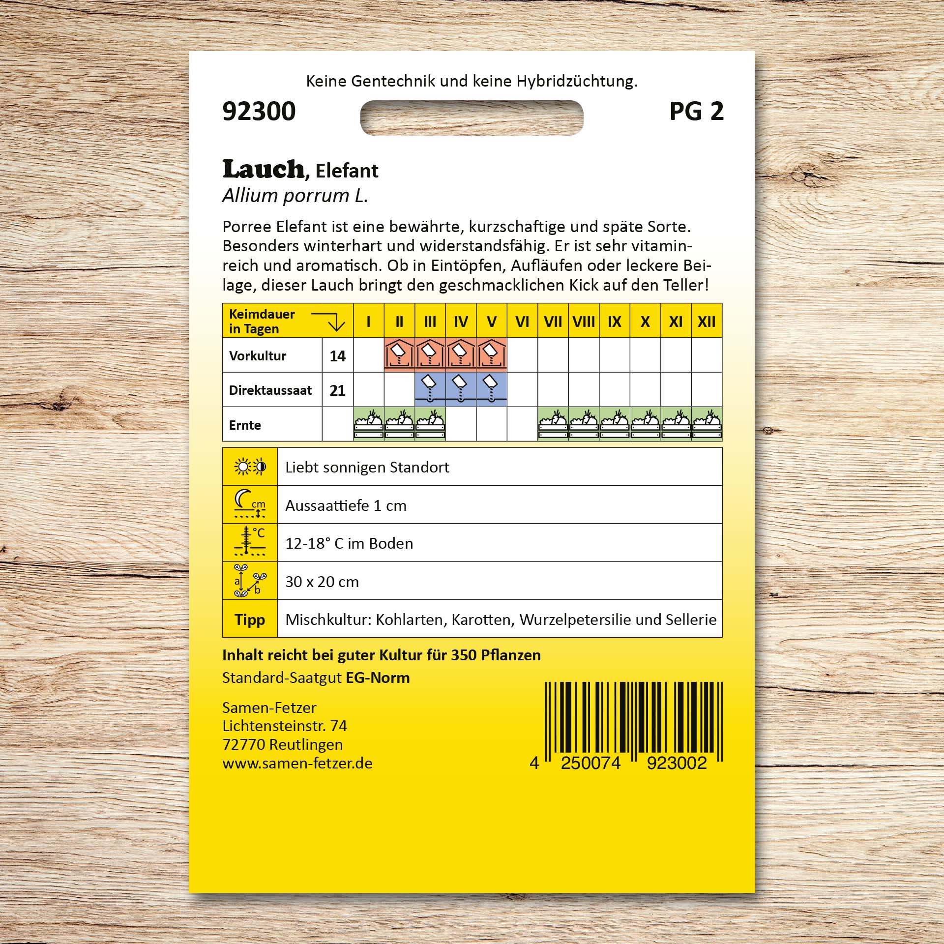 „Elefant“ ist eine bewährte, kurzschaftige, späte Lauchsorte die sich bis März ernten lässt. Dieser Porree eignet sich gut als Nachbar von Möhren, Sellerie und Salat. „Elefant“ ist sehr vitaminreich, aromatisch und lässt sich sehr vielseitig in der Küche verwenden. Ob in Eintöpfen, Aufläufen oder als leckere Beilage, dieser Lauch bringt den geschmacklichen Kick auf den Teller! Decken sie diesen Lauch sofort nach dem Auspflanzen mit unserem speziellen Gemüsefliegennetz (Maschenweite 0,8x0,8 mm) ab. Außerdem ist eine späte Pflanzung ist wegen der Lauchmotte empfehlenswert. Mit dem Anbau dieser historischen Sorte unterstützen Sie die Erhaltung der Sortenvielfalt.