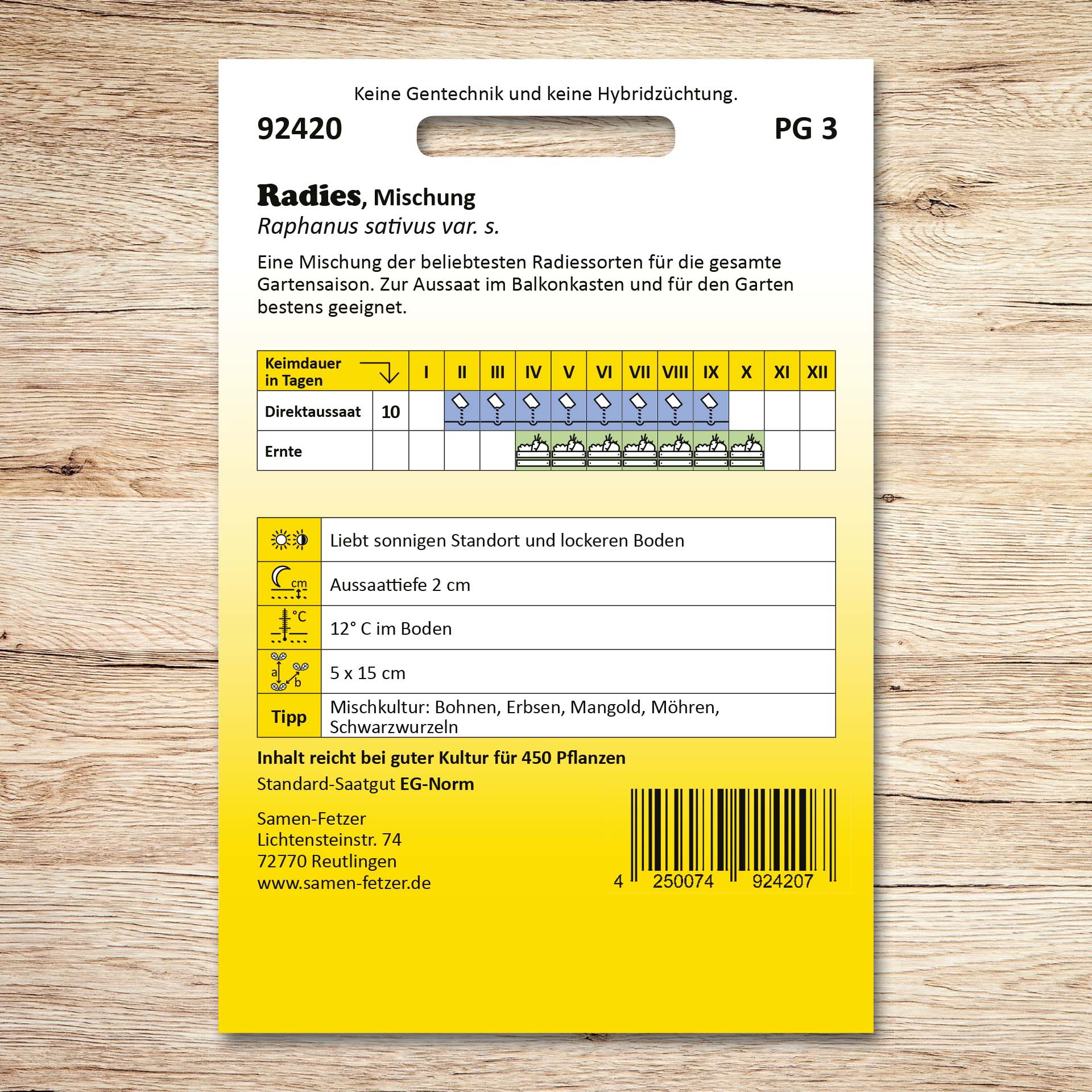 Diese Radies Mischung ist eine Zusammenstellung der beliebtesten Radies-Sorten für die ganze Gartensaison in verschiedenen Farben. Die Mischung ist für die Aussaat im Balkonkasten und für den Garten bestens geeignet. Ob in Salaten, als Rohkost, zur Garnitur, als Suppe oder Brotbelag, diese gesunden Radieschen-Sorten erzeugen ein frisches Geschmackserlebnis. Vereinzeln Sie zu dicht stehende Pflänzchen rechtzeitig auf 6-8 cm. Radieschen bevorzugen einen lockerer und immer feuchten Boden.