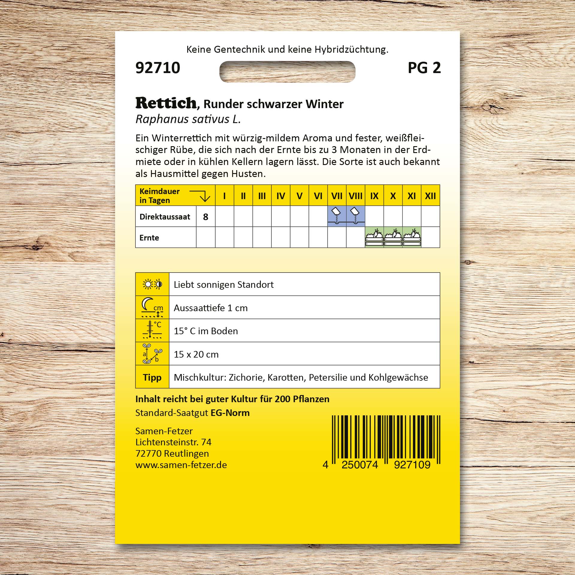 Der Winterrettich „Runder Schwarzer“ hat ein würzig-mildes Aroma. Die festen, weißfleischigen, runden Rüben lassen sich nach der Ernte bis zu 3 Monaten in der Erdmiete oder in kühlen Kellern lagern. Ob in Salaten, als Rohkost, zur Garnitur, als Suppe oder Brotbelag, dieser gesunde Rettich erzeugt ein frisches Geschmackserlebnis. Mit dem Anbau dieser historischen Rettichsorte unterstützen Sie die Erhaltung der Sortenvielfalt.
