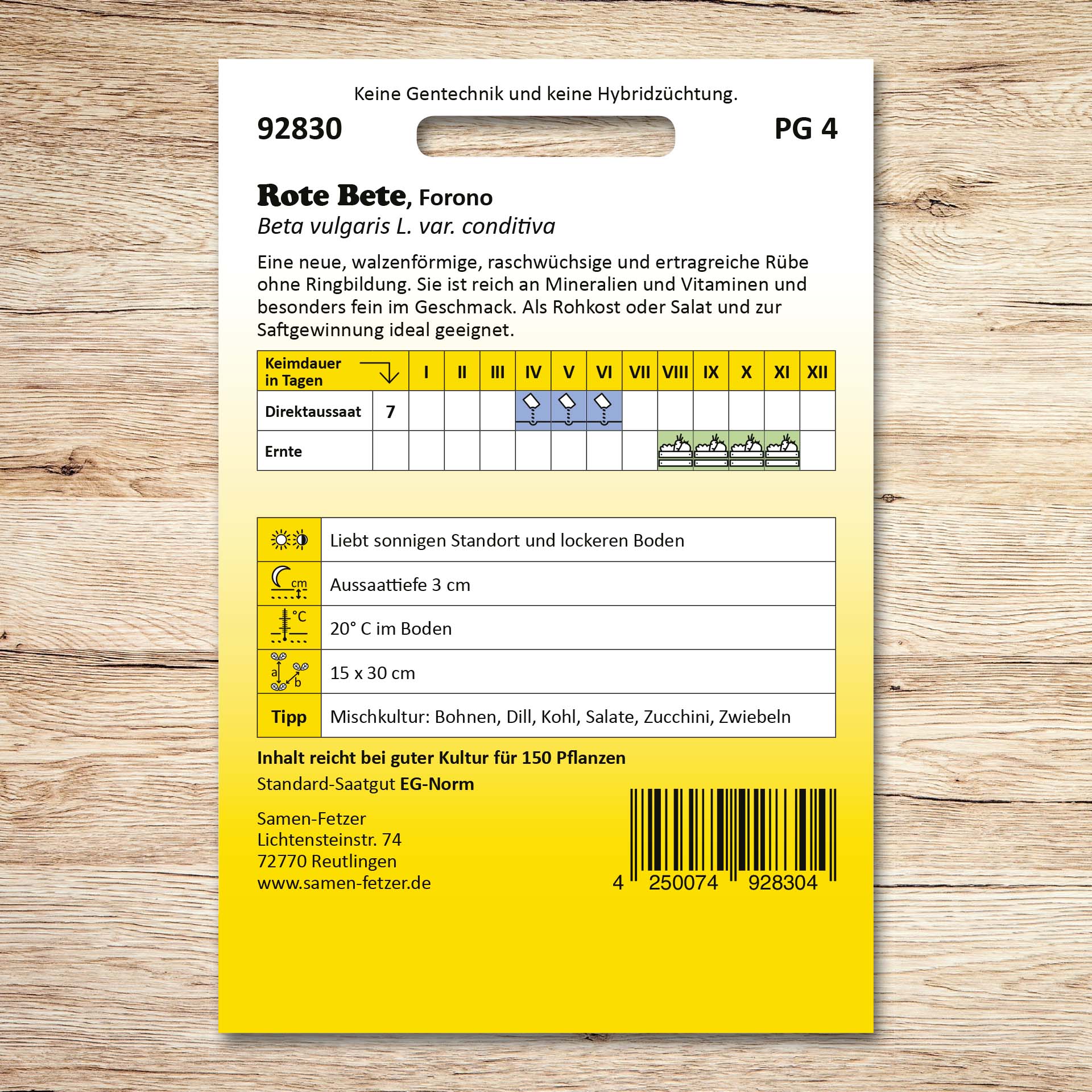 „Forono“ ist eine walzenförmige, raschwüchsige und ertragreiche Rübensorte ohne Ringelung. Diese roten Rüben sind reich an Mineralien und Vitaminen und besonders fein im Geschmack. In der Ausgewogenen und bewussten Küche sind Rote Rüben nicht wegzudenken. Als Rohkost, gedünstet oder eingelegt, sind sie eine gesunde Abwechslung. Vereinzeln Sie die Keimlinge nach dem Auflaufen auf den richtigen Pflanzabstand von 12-15 cm. Wenn Sie die Rote Beten für den Winterbedarf einlagern möchten, sollten Sie diese bis Ende Oktober ernten. Schlagen Sie die Kugeln in Sand ein und überwintern Sie diese frostfrei.