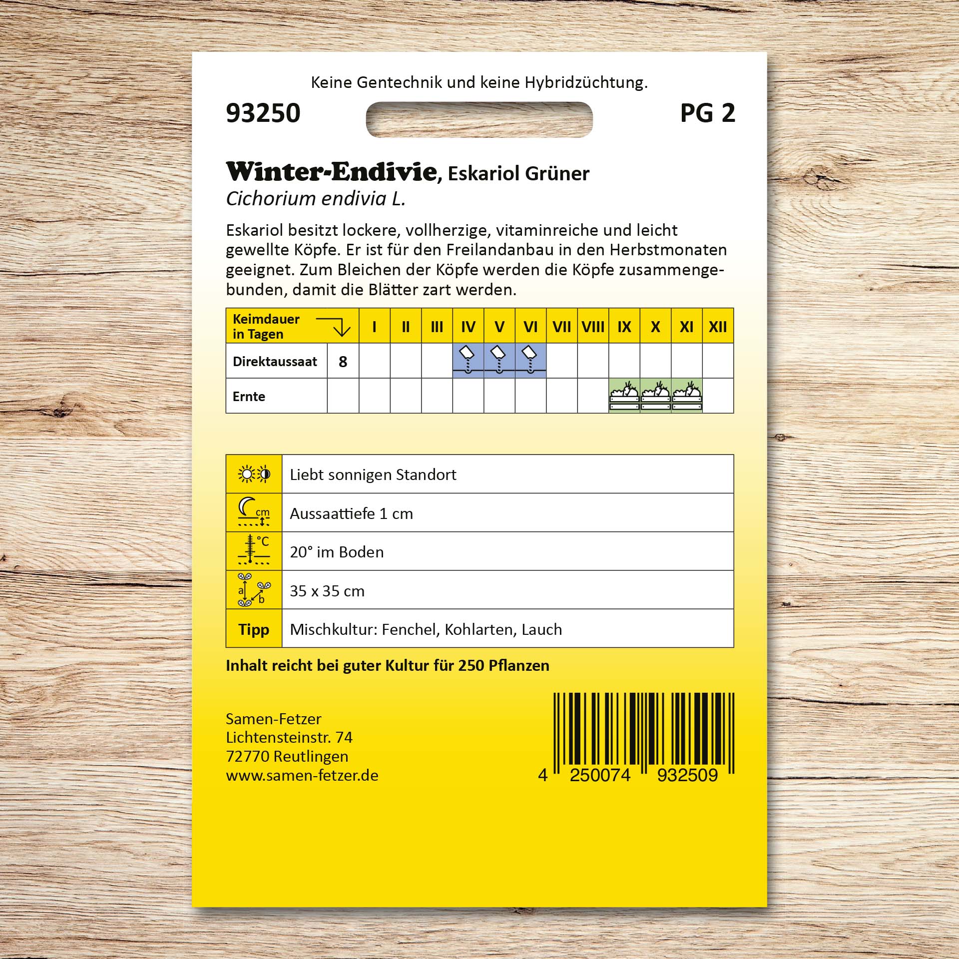 Der Winterendivien Salat „Eskariol Grüner“ besitzt vollherzige und leicht gewellte Köpfe. Diese frostunempfindliche Salatsorte ist im Einschlag am haltbarsten. „Eskariol“ ist sehr vitamin- und mineralstoffreich und eignet sich hervorragend für Mischsalate und zur Dekoration. Zum Bleichen werden die Köpfe 2 Wochen vor der Ernte zusammengebunden, damit die Blätter zart werden. Säen Sie nicht zu dicht im lockeren, kräftigen Boden. Mit dem Anbau dieser historischen Winterendivien Sorte unterstützen Sie die Erhaltung der Sortenvielfalt.